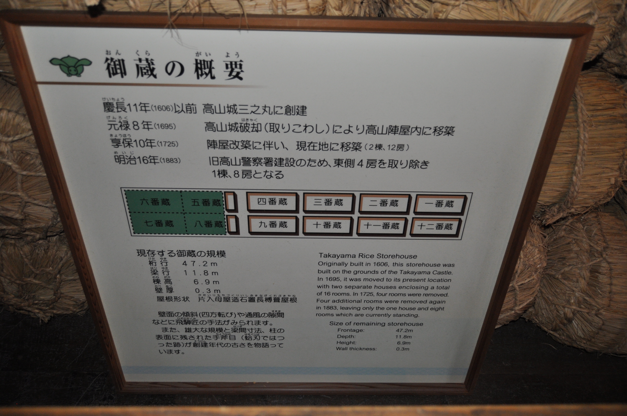 에도시대부터 내려오는 건물인데 총 12칸으로 이루어져 있으나, 4칸은 잘려나가고 8칸이 남아있다