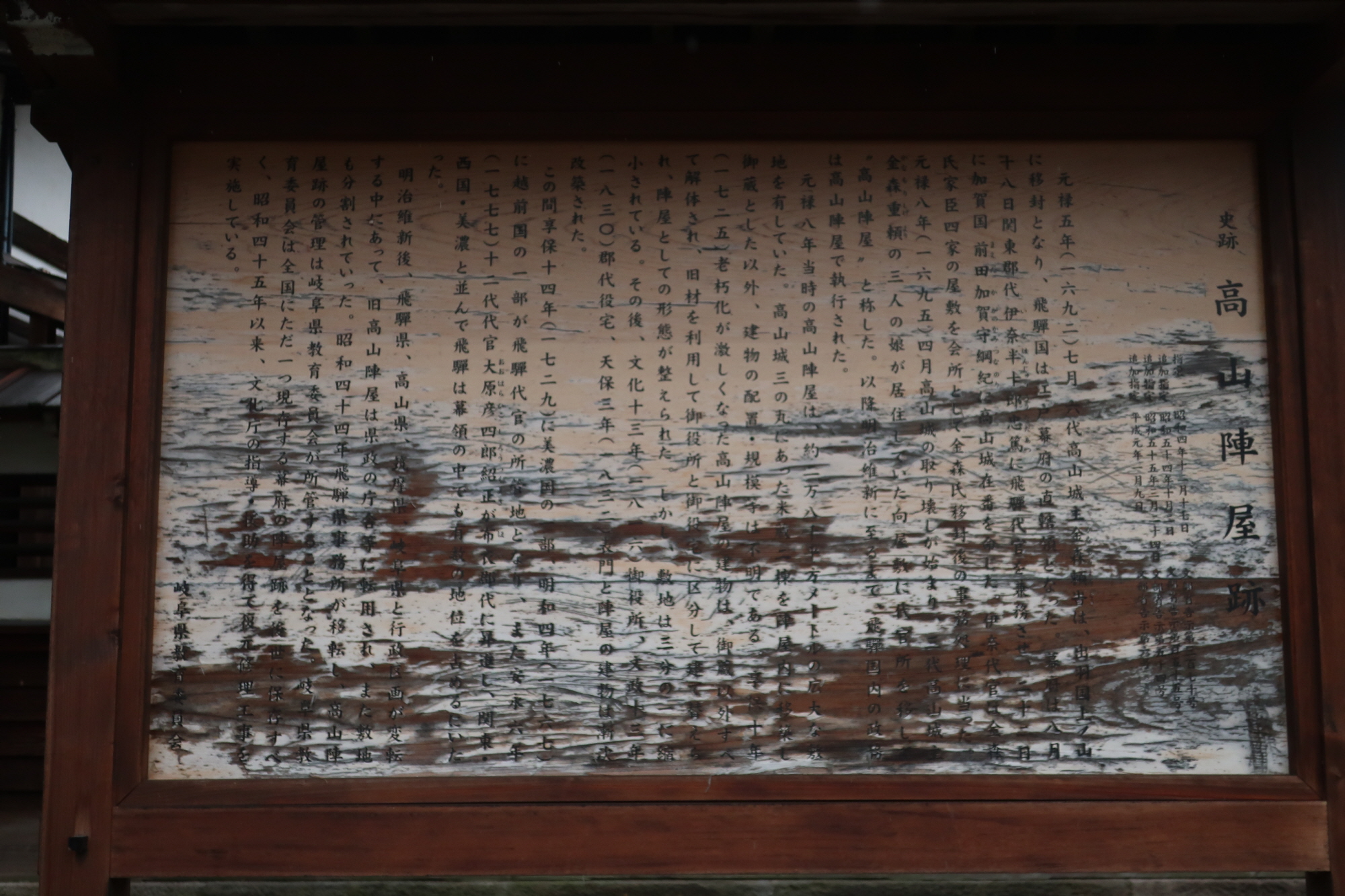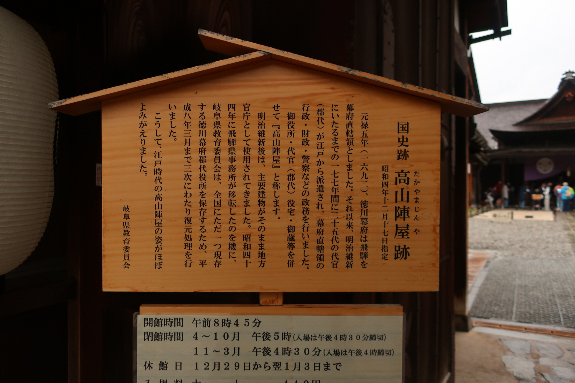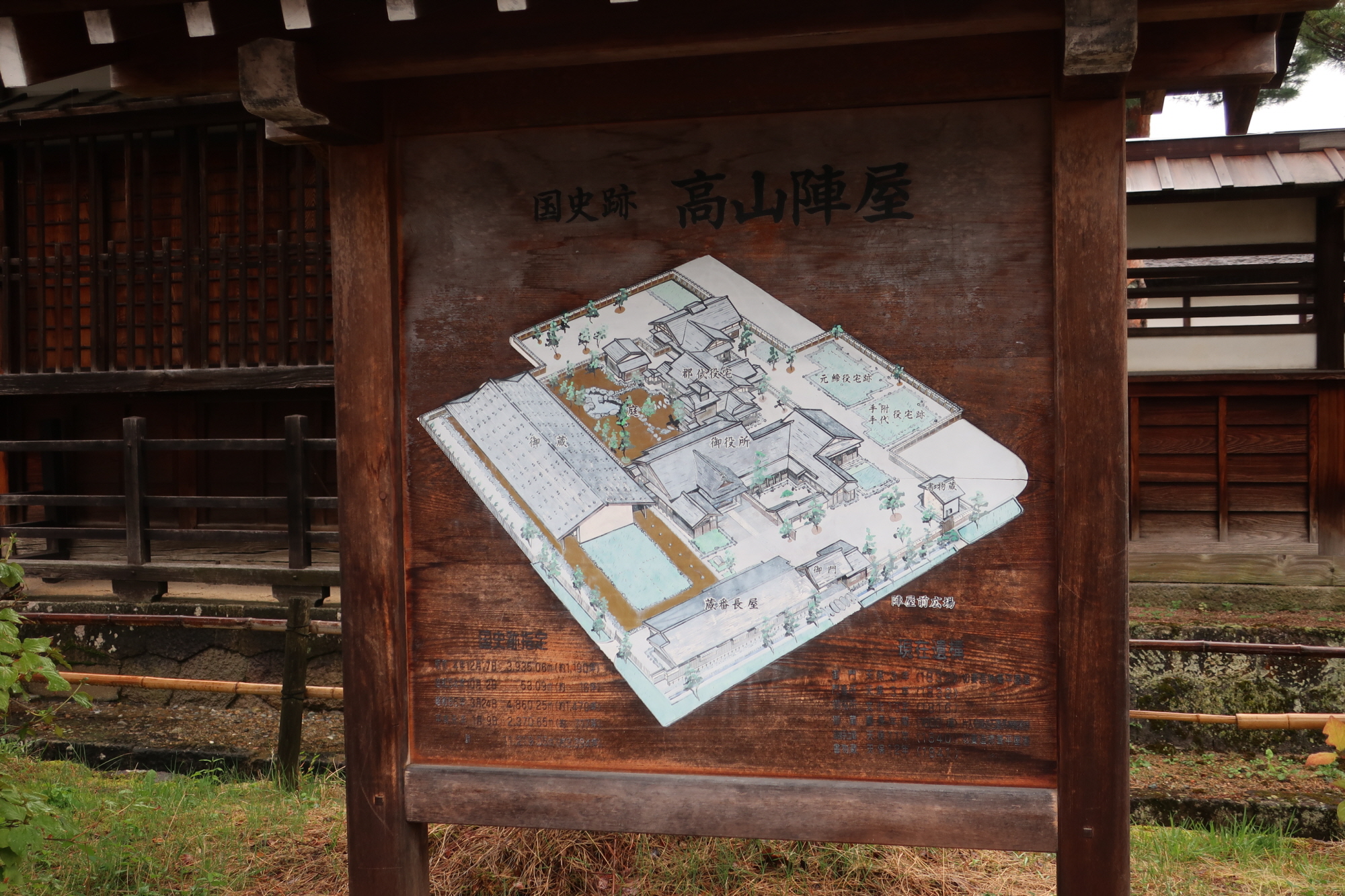 타카야마진야는 천령이었던 히다 지역을 다스리는 다이칸이 머무는 처소 겸 정무를 보는 곳이다. 본래 히다지역의 다이묘인 카나모리씨의 시모야시키였는데 히다가 천령이 된 후로는 다이칸이 머물렀다. 메이지유신 이후 기후현청의 타카야마 출장소로 쓰이면서 일부 건물들이 철거되었으나 중심건물 중 군역소 부분과 표문 및 문번소, 토장과 서물장은 에도시대 모습을 그대로 지킬 수 있었다. 이후 일본에서 유일하게 본래 모습을 지닌 진야로 가치를 평가받으면서 사적으로 지정되고, 예산을 들여 에도시대 말기의 모습으로 복원하였다.