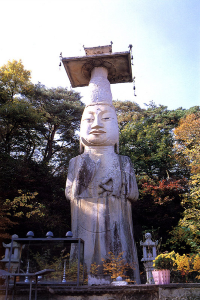 법주사에는 본래 용화전이 있고 그 안에 거대한 미륵불입상이 있다고 전해지지만 흥선대원군이 당백전을 주조하기 위해여 녹였다고 합니다. 일제시대 이를 복원하기 위해 조각가 김복진이 거대 시멘트 입상을 세웠으나 균열이 가자 수십년에 걸쳐 김복진의 불상을 그대로 따서 청동미륵불을 만들었습니다. 높이는 기단 8미터, 불상 25미터입니다. 문화재적 가치는 없으나 근대 조각으로써의 가치는 있습니다.