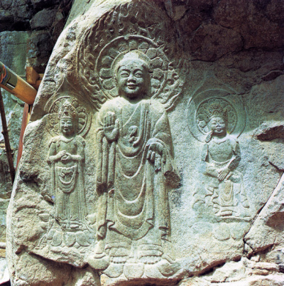 서산마애삼존불(국보 84호) - 백제. 오른쪽 반가사유상이 미륵보살인 것으로 대체로 보고 있습니다.